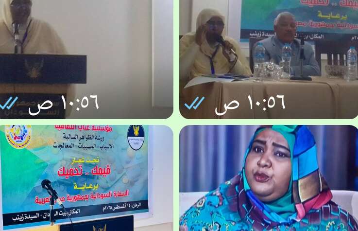 وقالت ان الورشة تحت شعار قيمك تحميك وهي رسالة ان القيم وعي ودروع للمجتمع من الإنزلاق الأخلاقي الذي يضعف بنيتنا المجتمعية المتماسكة وهذه الظواهر نتيجة أسباب اقتصادية ومجتمعية نتيجة ضعف الرقابة وشددت البدوي على ضرورة المعالجات عبر الضمير الجمعي للشعب السوداني . وزادت ان مؤسسة عتاب اخذت على عاتقها إضاءة التخطيط وتفعيل القيم لدحر هذه الظواهر السالبة للوصول إلى مجتمع معافى .